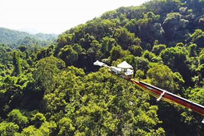 研究人员宋亮、吴毅正顺着吊臂作水平延伸来接近林冠,这次他们将对望天树作剪枝取样的监测分析。