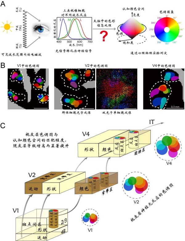 为探索这个复杂的脑科学问题,王伟与唐世明教授实验室合作,将双光子成像等先进技术,用在了该课题的研究上。研究发现,在V1、V2和V4三个连续视觉脑区中,都存在着众多大小不一离散分布的颜色反应斑点区,编码不同光波波段的神经元就聚焦这些斑点区内,从而形成了由相邻色调拼接构成的“色调图”。这些“色调图”犹如许许多多大小不等的彩虹,散布在各个视觉大脑表面上。