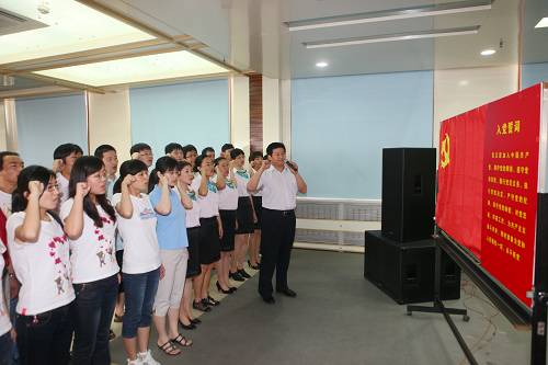 一批新党员面对鲜红的党旗和入党誓词,在胡立志的领誓下,举起右手庄严宣誓,为共产主义事业奋斗终身。