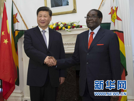 穆加贝表示,热烈欢迎习近平主席访问津巴布韦。中国是津巴布韦的全天候朋友。津方高度赞赏中方始终对包括津巴布韦在内非洲国家真诚相待,感谢中方长期以来给予津方各方面宝贵帮助。津方希望在国家经济社会发展中借鉴中国经验,继续得到中方支持,在农业、工业、基础设施等领域加强同中方合作。
