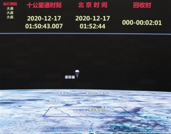 在北京航天飞行控制中心指挥大厅拍摄的嫦娥五号返回器着陆示意图。新华社记者 金立旺摄