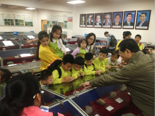 孩子们穿着统一的“搭桥课堂”服装,跟随科普讲解员走进地学与资源科普基地标本馆,瞬间就被900余种琳琅满目的标本所吸引。老科学家志愿者为小朋友介绍了各种“石头”和鱼形类、两栖类、鸟类等古生物化石的特殊经历和故事,告诉孩子们,“石头”是怎样形成的?怎样从“石头”中提取有用的矿物等科普知识,让小朋友简单了解了地质历史时期的地球环境演化规律。孩子们集体观看了海洋知识影像片“科学”号海洋科考船。结合“搭桥课堂”知识点,带队导读师以古生物化石为主题,让孩子们自己动手制作了“美丽的化石”。通过讲解员2个半小时悉心有趣地讲解,为孩子们揭开了“石头”和古生物化石的神秘面纱。同时,在导读师的引导下,孩子们聚精会神,全心投入制作化石的任务。整个参观学习实践过程,孩子们在学习地球科学知识的同时,又漂亮地完成了美术专业的学习任务。