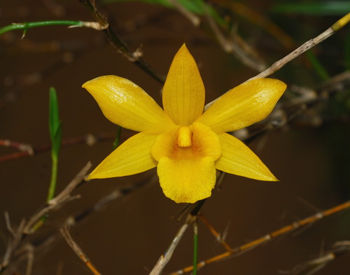 细叶石斛(Dendrobium hancockiiRolfe)为兰科多年生草本。茎直立,质地较硬,圆柱形,长15~80cm,直径3~10mm,具纵槽纹,上部多分枝,干后深黄色或橙黄色,有光泽,节间长2.5~4.7cm;叶通常3~6枚,互生于茎枝上部,线形,长3~8厘米,先端钝圆,微凹。总状花序腋生,具1~2朵花;花金黄色,蜡质,开展,仅唇瓣侧裂片内侧具少数红色条纹;唇瓣长宽相等,1~2厘米,基部具1个胼胝体,中部3裂;唇盘通常淡绿色,从两侧裂片之间到中裂片上密布短乳突状毛;花期5~6月。