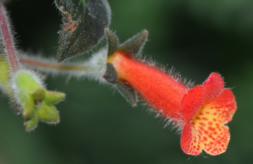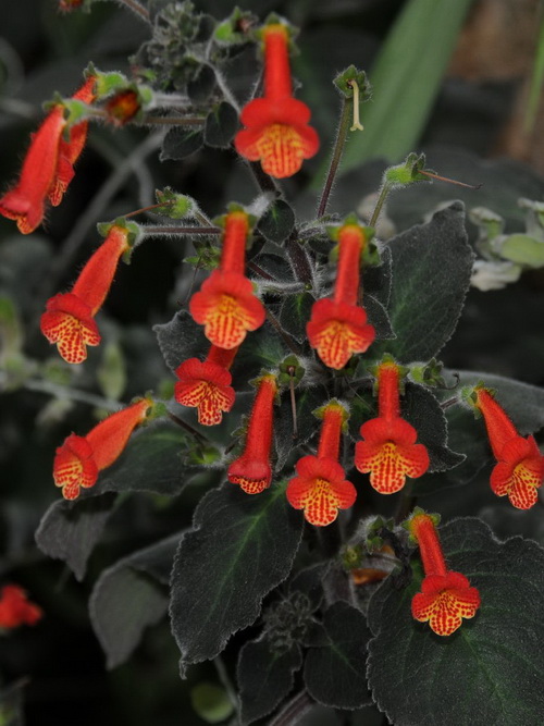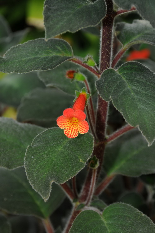 花猫(Kohleria hybrida)也称“花脸”,是苦苣苔科花脸苣苔属的多年生草本植物,别名艳斑苦苣苔、角桐草。相信凡是见过它的人都会被她那张艳丽的“花脸”深深地吸引。其花朵外形特殊,鲜红的细长花筒鲜披满绒毛,花瓣具有显眼的斑点和线条,让人忍不住多看她几眼。它跟我们所熟悉的大岩桐、非洲堇、口红花、袋鼠花是同门家族的成员。但是花猫长得特别有个性,植物密被茸毛,叶色多变,除深浅不同的绿色或红色外,部分叶面还有漂亮的斑纹,有些绿色叶片边缘还镶一圈红色绒毛,叶缘有细锯齿或圆齿。花通常成群或单朵生于叶子下面,花瓣先端有5片裂瓣,裂瓣上面布满各色斑点。其花色也因品种的不同而丰富多彩。