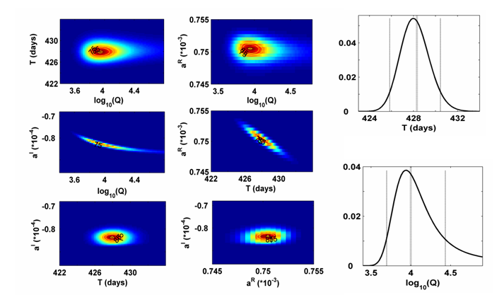 (左:参数联合概率密度分布;右:周期T和品质因子Q概率密度分布)