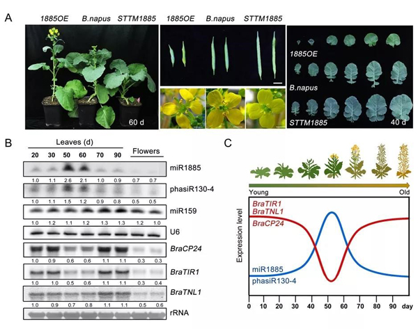 图1. miR1885动态调控油菜的生长发育与免疫。A. miR1885异位表达的甘蓝型油菜生长发育表型。左图为萌发后60天的油菜全株;中间图为油菜的果荚(上)和花(下);右侧图为萌发后40天的油菜叶片。B. 不同生长时期的油菜叶片与油菜花中小RNA与靶基因的表达量。C.miR1885, phasiR130-4及其靶基因在不同生长时期油菜中的表达模式。蓝色线条代表miR1885与phasiR130-4的表达趋势;红色线条代表靶基因 BraTIR1, BraTNL1, BraCP24的表达趋势。