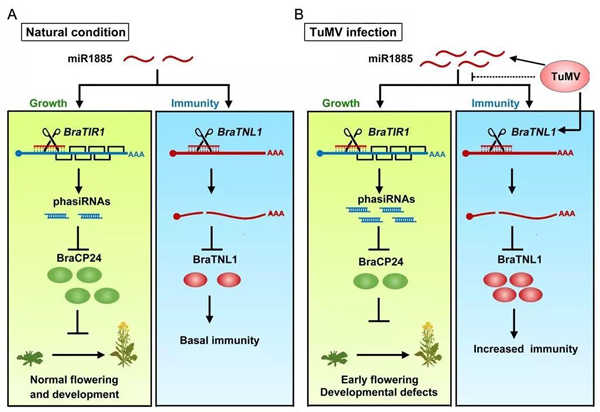 图2. miR1885通过不同的作用方式对油菜的生长和免疫进行调控。A. 在自然生长状态下,miR1885及其产生的phasiR130-4本底水平表达,维持油菜抗病基因的基础抗性,保证光合作用相关基因BraCP24的表达。B. TuMV的侵染促进miR1885, phasiR130-4的产生,同时提高油菜抗病基因的表达,最终造成光合作用相关基因BraCP24的表达被抑制,促使油菜发育出现异常,提前开花。