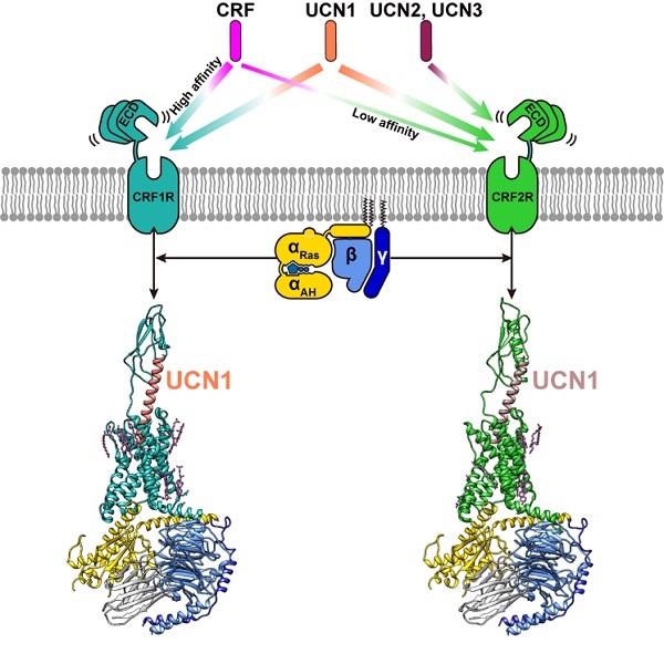 促肾上腺皮质激素释放因子受体(Corticotropin-Releasing Factor Receptors) CRF1R和CRF2R是B类GPCR的重要成员,在中枢和外周神经系统中广泛表达,主要通过偶联下游Gs蛋白参与体内内分泌系统、行为系统和免疫系统的压力应答。研究表明,CRF1R可能与压力导致的酗酒和药物滥用相关。CRF1R和CRF2R在体内被内源性配体CRF和UCN1-3 (urocotins 1-3)激活。CRF初次在羊下丘脑中被发现,能促进促肾上腺皮质激素(Adrenocorticotropic hormone, ACTH)的释放从而在下丘脑-垂体-肾上腺轴(Hypothalamic–pituitary–adrenal, HPA)中发挥关键作用。与UCN1对CRF1R和CRF2R都有高亲和力不同,CRF对CRF1R的亲和力明显高于CRF2R,而UCN2和UCN3则表现出了CRF2R选择性激动剂的特性。
