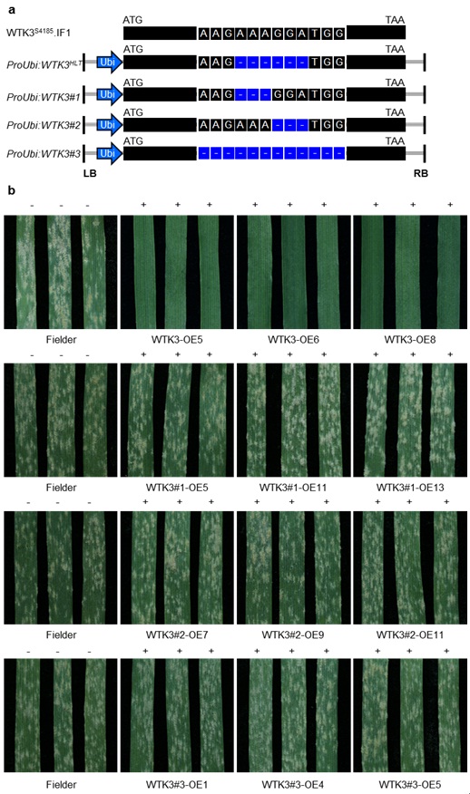 通过WTK3基因的过表达载体ProUbi:WTK3、分别缺失3 bp序列载体ProUbi:WTK3#1和ProUbi:WTK3#2、以及缺失12 bp序列载体ProUbi:WTK3#的人工变体进行小麦遗传转化,根据转基因后代抗病性鉴定结果,发现WTK3基因只有在第5外显子上缺失6 bp的情况下才能获得抗白粉病功能(图)。