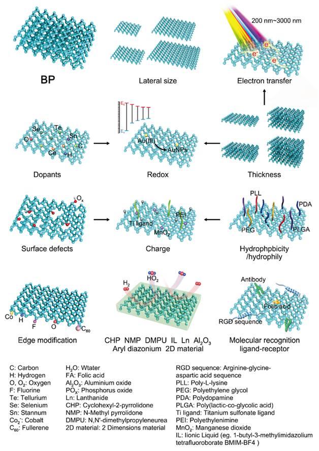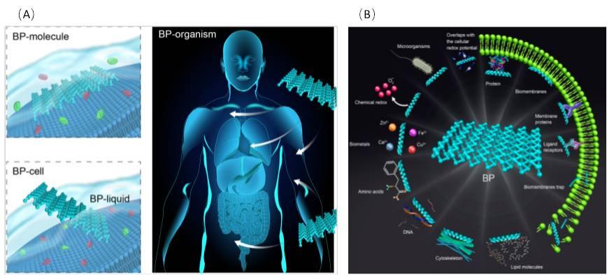 图1. 黑磷-生物系统界面及其相互作用示意图。