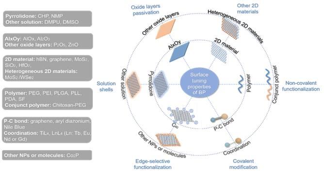此外,研究团队还讨论了黑磷的环境行为和其进入环境后引起的潜在环境风险。基于对黑磷-生物界面知识的积累与其生物效应的分子机制,研究团队还总结了黑磷纳米材料的安全设计方法和改变黑磷界面物理化学性质的策略(图4),特别是如何增强黑磷的化学稳定性和调节黑磷-生物相互作用等(图5),这是影响黑磷生物学行为的关键。这篇综述有助于研究者理解黑磷-生物界面、生物活性、应用中面临的挑战和相应策略,这些方法将有效促进黑磷这一新型二维纳米材料在各个领域的探索和实际应用。
