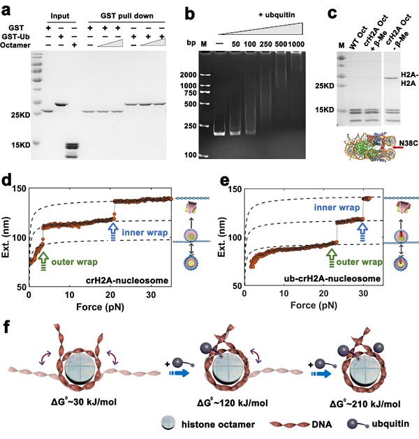 H2A作为最早发现被泛素化修饰的组蛋白,在高等真核生物中,约有5-15%的H2A在高度保守的K119位被单泛素化修饰(ubH2A)。研究发现ubH2A大量富集在不活跃的近着丝粒区、失活的X染色体和沉默的发育基因区域。ubH2A的建立主要依赖多梳复合物(PRC)中的RING1B(E3),敲除RING1B能显著降低特点基因启动子附近的ubH2A水平,并导致ubH2A总体水平的显著下降。但是对于ubH2A建立起来后如何调控核小体仍然不清楚。2月5日,中国科学院生物物理研究所李国红、生物物理所客座研究员/首都医科大学陈萍与中国科学院物理研究所李伟合作团队在《美国化学会志》(JACS)上在线发表了题为Histone H2A Ubiquitination Reinforces Mechanical Stability and Asymmetry at theSingle-Nucleosome Level 的文章,从单分子水平上探讨ubH2A对核小体结构调控的分子机制。