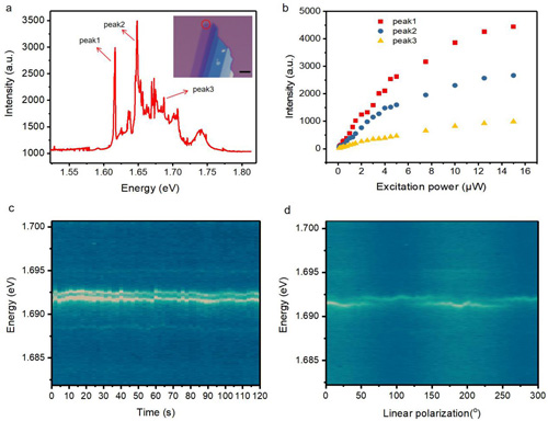 图1. 单层WSe2在零磁场下的荧光光谱性质:(a)单层WSe2材料边缘的荧光光谱,不同尖峰对应不同的单光子复合发光。(b)和(c)荧光强度和某一特征光谱随时间的变化。(d)具有精细劈裂的荧光光谱的偏振响应。
