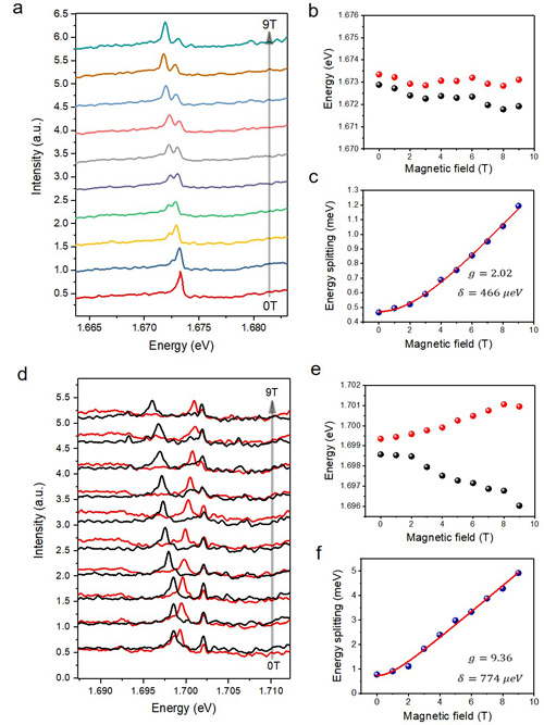 图2. 法拉第构型下的两种单光子发射峰的磁光性质:(a-c)具有较小g因子和较小精细结构劈裂的单光子源(typeⅠ)的磁光光谱和g因子与精细结构劈裂的拟合结果。(d-f)具有较大g因子和较大精细结构劈裂的单光子源(typeⅡ)的极化分辨的磁光光谱。