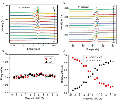 图3. 第三种类型单光子源(typeⅢ)的极化分辨的磁光光谱:(a-b)不同磁场下左右旋收集的磁光光谱。(c)左右旋收集的发光峰能量几乎不随磁场变化。(d)左右旋收集的荧光相对强度随磁场的变化。