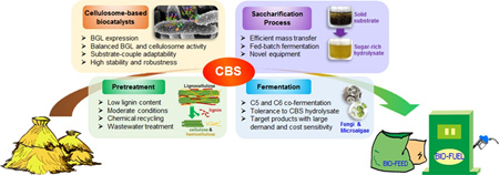 木质纤维素生物质具有替代化石资源的巨大潜力,从而有效缓解了全球对原油的依赖。虽然目前国内外已有一些纤维素乙醇等木质纤维素产品问世,但与化石来源的产品相比,木质纤维素产品迄今为止大多仍不具备市场竞争力,因此亟需提高木质纤维素转化技术的经济性。木质纤维素转化主要包括预处理、酶解糖化以及发酵三个步骤,其中糖化被认为是木质纤维素生物转化可行性的决定性因素。为此,中国科学院青岛生物能源与过程研究所研究员崔球带领的代谢物组学研究组另辟蹊径,提出了基于纤维小体全菌催化剂的木质纤维素“整合生物糖化”(简称CBS)策略,并在2月24日上线的综述文章中系统阐述了该策略的研究现状、技术优势,以及未来需要解决的问题和方向[Liu, Y.-J., et al., 2020 Consolidated bio-saccharification: Leading lignocellulose bioconversion into the real world. Biotechnol Adv doi: 10.1016/j.biotechadv.2020.107535],为木质纤维素生物转化的工业化实现提供了技术指引。