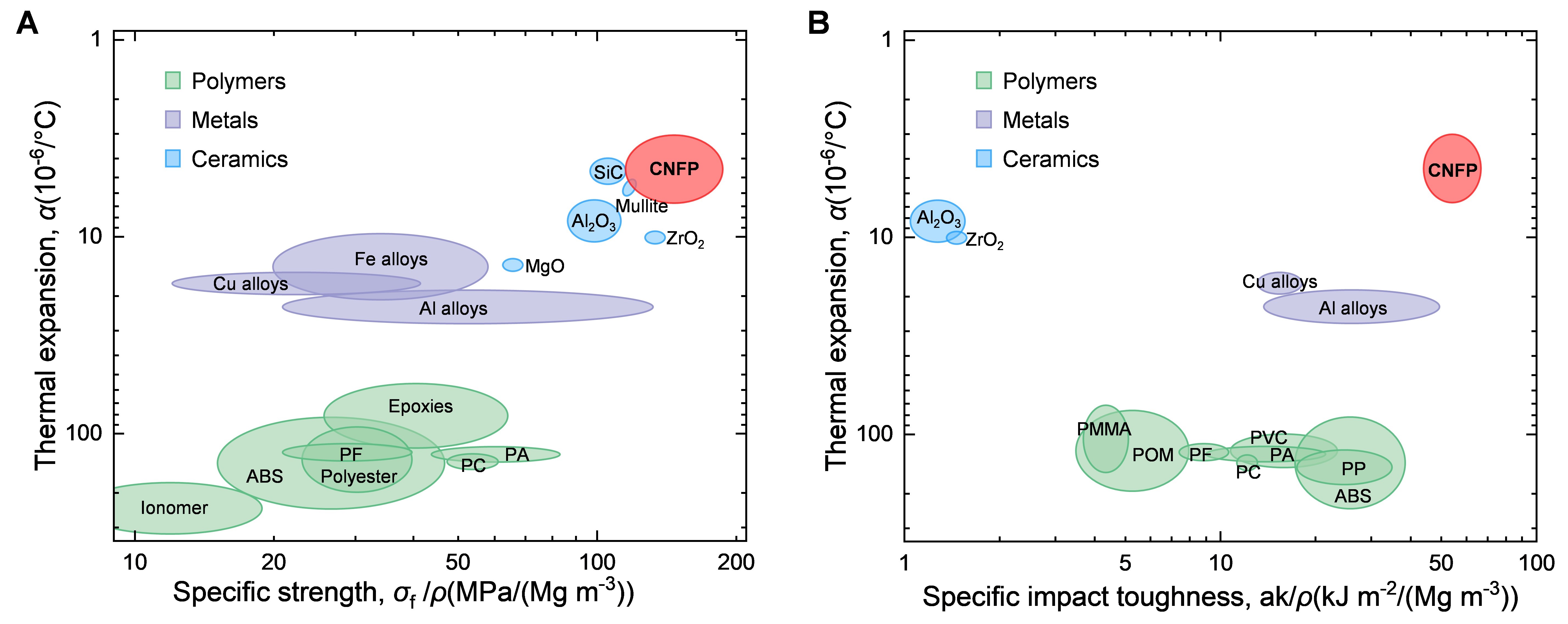 图2. CNFP与多种工程材料热膨胀系数和比强度、比冲击韧性的Ashby图。(A)热膨胀系数和比强度Ashby图,表明CNFP具有优于传统合金、工程塑料和陶瓷的比强度和热膨胀系数。(B)热膨胀系数和比冲击韧性Ashby图,表明CNFP具有优于传统合金、工程塑料和陶瓷的比韧性和热膨胀系数。