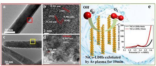 课题组创新性地采用Ar等离子体,将一维NiCo-LDHs纳米线剥离成二维纳米薄片,形成三维树枝状结构,不仅增加NiCo-LDHs的电化学活性表面积,而且暴露出更高的Ni3+和Co3+的活性位点,从而有效提高了NiCo-LDHs的析氧性能。得到的NiCo-LDHs表现出较低的起始电位(1.48 V vs. RHE)和较长的稳定性(6000 循环,电流密度保持率为82%)。该研究工作为等离子体处理二维材料提供了新方法,为开发廉价高性能的氧析出反应催化剂提供了新思路。