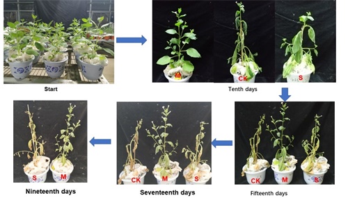 CK:不加保水剂的对照处理;M:自制新型保水剂处理;S:丙烯酰胺保水剂处理断水后不同处理烟草生长状况