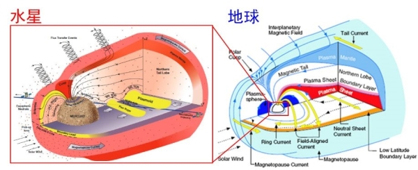 在太阳系內禀偶极磁场行星中,水星的磁场最弱,其磁场强度在赤道表面比地磁场低两个数量级。水星弱磁场受强太阳风驱动形成太阳系中最活跃、尺度最小的行星磁层(图1)。其辐射带、电离层、等离子层及大气层等明显消失,由此导致行星空间环境显著区别于地球。研究水星磁层动力学过程及空间环境特征是认识太阳风向弱磁层空间传输能量和物质一般规律的重要途径,同时对理解地球空间、认知电离层和磁层尺度对空间环境影响等具有重要意义。