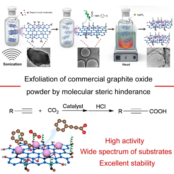 基于二维材料的复合催化剂受到关注。这些催化剂具有充分暴露的活性位点、增强的物质传递速率、清晰的表界面等优点。但对于廉价易得的氧化石墨粉末,难以制备具有均一形貌可控的二维材料复合催化剂。因此,唐智勇课题组通过在超声过程中加入叔丁基对苯胺分子与氧化石墨(GO)粉末中的羧基反应,开发出空间位阻,能够有效剥离及大量生产超薄ter-GO氧化石墨烯纳米片(如图);形成的酰胺键利于捕捉二氧化碳,氧化石墨烯表面丰富的羟基和环氧基起到稳定保护银纳米粒子作用。研究表明,在40 ℃和常压条件下,合成的Ag/ ter-GO在24小时内有效催化苯乙炔转化为苯丙酸,转化率达到97.2%,催化剂的转化频率高达3.12 h -1。