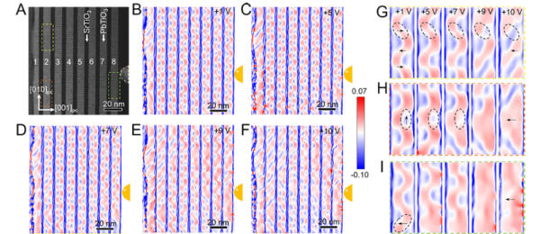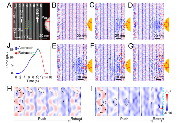 近年来,科学家先后在理论和实验上发现了铁电材料中可以形成尺寸低至几个纳米的极性拓扑结构,如通量闭合畴、涡旋畴和斯格明子等。极性拓扑畴结构具有拓扑保护性、尺寸小等优势,这引起探索新一代非易失性超高密度信息存储器件的兴趣。实际器件操作大多是基于外场对结构单元极化态和拓扑相变的调控,研究单个铁电畴结构的极化分布以及外场操控下拓扑相变动力学过程是器件应用的基础。极性拓扑结构的形成是体系中弹性能、静电能和梯度能之间在微小差别内相互竞争平衡的结果,实现局域外场对微区结构的精确调控以及相变过程的精细表征是一种挑战。