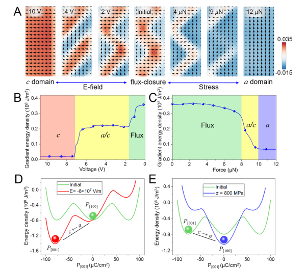 在外电场操控下(图2),通过畴壁的移动实现通量闭合核的横向移动,极化方向与外电场一致的c畴逐渐变大,而极化方向与外电场方向相反的c畴逐渐减小至消失,伴随着180°畴壁和通量闭合核的消失,形成中间态的a/c畴结构,进一步增大电场可以获得单一的c畴。在应力场操控下(图3),垂直于界面的压缩应力导致通量闭合结构中c畴的收缩和a畴的增大,并伴随着通量闭合核沿180°畴壁向界面的移动,当通量闭合核移动到界面并消失则变为中间态a/c畴,进一步增大应力则可以获得单一的a畴。以上演化过程为完全可逆的,当撤掉外界刺激后则恢复到初始的通量闭合畴结构。相场模拟结果可以完全再现实验过程(图4),获得相变过程中几种能量的演化及相互竞争变化关系,揭示铁电通量闭合畴外场调控的物理原理。