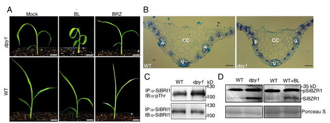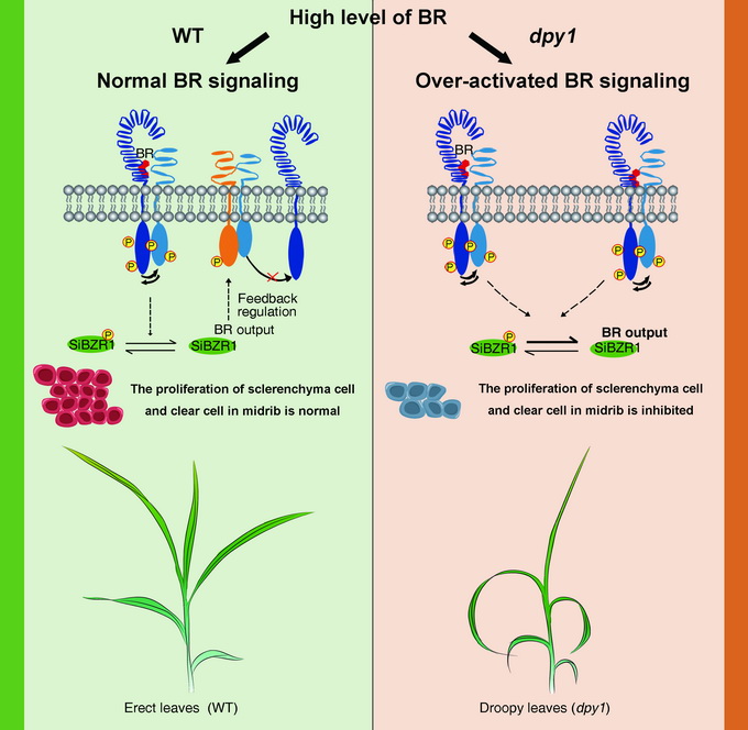 该研究利用谷子(Setaria italica)叶片严重披垂的突变体 (droopy leaf 1,dpy1),克隆了控制谷子叶片披垂的基因(DPY1)。该基因编码了一个新的富亮氨酸重复型膜蛋白受体激酶,其编码蛋白可以与油菜素内酯的共受体(SiBAK1)通过胞内的激酶结构互作,并竞争性地抑制油菜素内酯受体(SiBRI1)与共受体(SiBAK1)间的互作水平,从而以负反馈的方式抑制早期油菜素内酯信号的过度激活。因此,DPY1起到了“刹车”基因的作用(图2)。该过程可以促进叶片中脉的远轴厚壁细胞分裂及木质素的沉积,从而提高叶片的支撑力并促进叶片直立性。此外,该研究通过玉米披垂叶基因回补谷子突变体(dpy1)试验,证实在禾本科作物中这种机制是保守和共享的。该研究成果揭示了禾谷类作物叶片坚实度的遗传学基础及其调控机制,为作物株型改良提供了新的基因资源及研究思路。