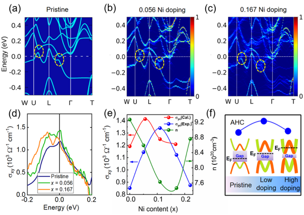 为了理解内禀机制增强的原因,研究人员采用超胞近似下的反折叠能带模型对Ni掺杂的Co3-xNixSn2S2进行理论计算。结果表明(图3),随着掺杂量增加EF明显向上移动,同时能带发生展宽从而使得自旋-轨道耦合打开的节线环能隙变窄。节线环之间的能隙窄化使得能隙间的贝利曲率增强,且少量Ni掺杂使得EF处于窄化后的能隙中,从而导致了内禀AHC的增强。实验所得载流子浓度呈现出与能隙对应的极小值。进一步增加Ni含量,能带展宽加剧,能隙间贝利曲率更强,但EF移至能隙以上,AHC进而下降。