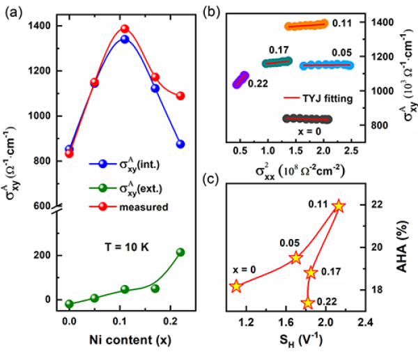 近日,中国科学院物理研究所/北京凝聚态物理国家研究中心磁学国家重点实验室M05组博士生申建雷、博士生曾庆祺和刘恩克等,与南方科技大学博士姚秋石和副教授刘奇航等合作,在多电子Ni掺杂的Co3-xNixSn2S2中观察到异常增强的AHC (1380 S/cm),并同时获得增强的AHA (22%)和反常霍尔因子SH (2.3V-1)(图2)。这一异常增强现象无法基于刚带模型来理解。采用TYJ标度关系对反常霍尔效应的内、外禀贡献进行了分离,结果显示内禀AHC为1340 S/cm,表明异常增强的AHC几乎完全来自于内禀贡献(图2)。这意味着无序掺杂对体系的贝利曲率产生了显著影响。值得一提的是,本研究中掺杂引入的异类原子所产生的散射作用使得外禀AHC也有所增强,但增幅较为微弱。