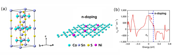 图1. (a) Co3Sn2S2的晶体结构和Co/Ni组成的kagome层。(b)电子掺杂后Co3Sn2S2的反常霍尔电导演化示意。