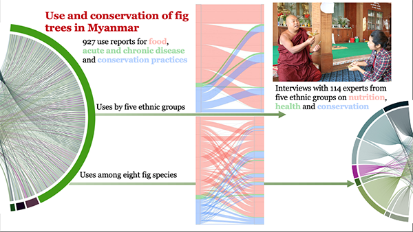 中国科学院昆明植物研究所民族植物学与自然资源管理课题组依托昆明植物所以及东南亚生物多样性中心的科研平台,在中国和缅甸开展深入的药食用植物相关传统知识研究。科研人员分别对云南杜鹃花属食用植物(图1)、南疆药茶植物(图2)、缅甸孟族药用植物(图3)以及缅甸南掸邦榕属药食用植物的传统知识(图4)展开系统的定点研究。这些研究阐述了在不同地区当地民族基于当地的生物文化多样性形成丰富多元的药食用植物传统知识,探讨这些传统知识在当地人健康保健中发挥的作用以及这些知识对现代医学研究的意义,并讨论这些植物资源的可持续利用。
