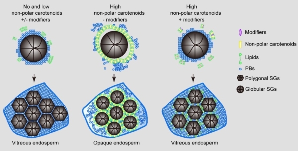 研究人员利用普通硬质玉米自交系W64A和粉质玉米自交系A619,通过连续8代回交,构建A619背景下的硬质和粉质近等基因系NILW64A和NILA619。通过BSA测序、精细定位和RNAi遗传验证,克隆到影响硬质胚乳形成的主效QTL——Ven1。该基因编码β-胡萝卜素羟化酶3(β-carotene hydroxylase 3,HYD3)在胚乳淀粉细胞中高表达,蛋白定位于淀粉体膜内侧。Ven1在粉质近等基因系NILA619中存在片段缺失且表达量低,导致β-胡萝卜素不能被羟化为下游的极性胡萝卜素,使其及上游的其它非极性胡萝卜素含量升高,从而改变淀粉体膜的物理化学性质。NILA619的淀粉体膜(内含淀粉粒)稳定性增强且不规则扩张,在胚乳细胞脱水过程中降解延迟,阻碍蛋白体和淀粉粒间的相互作用及蛋白基质网格(matrix grid)的形成,籽粒成熟时则形成粉质胚乳。相反,硬质近等基因系NILW64A中Ven1高表达,非极性类胡萝卜素含量降低,淀粉体膜形态规则且易降解,有利于蛋白体及细胞质在淀粉粒表面的浓缩,形成致密的蛋白基质网格包围结构,这是硬质胚乳形成的重要基础。为证明非极性胡萝卜素过量累积是导致A619粉质表型的原因,研究人员对A619进行大规模EMS诱变,获得多个类胡萝卜素上游合成途径受到抑制的突变体材料,其共同特征是从粉质胚乳变成硬质胚乳,因此,命名为Ven1的抑制子(suppressors of Ven1A619,Ves)。通过GWAS分析,发现自然群体中还存在多个Ven1的修饰因子,即在不改变胡萝卜素成分的条件下,形成硬质胚乳。该研究揭示类胡萝卜素通过影响淀粉体膜的稳定性进而影响硬质胚乳形成的新的分子遗传机制,有利于培育高胡萝卜素硬质玉米品种。