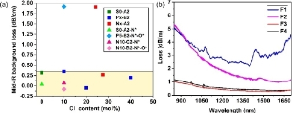 图1.铅锗酸盐重金属氧化物中红外玻璃(a)氯化物除羟样品的背景损耗与(b)挤压法制备光纤的损耗对比