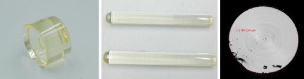 图2.预制棒挤压用铅锗酸盐重金属氧化物中红外玻璃毛坯、挤压成型预制棒芯棒和制备的损耗测试实芯光纤