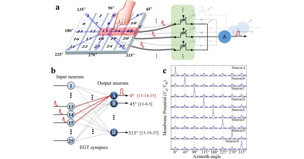 图2. (a) 基于电解质栅控晶体管的脉冲神经网络触觉感知系统实现方案;(b) 脉冲神经网络结构图,其中输入神经元和输出神经元通过电解质栅控晶体管(突触)进行连接;(c) 不同移动方位角条件下各神经元的膜电位变化。经过学习后,神经元的最大输出与方位角呈现良好的映射关系。