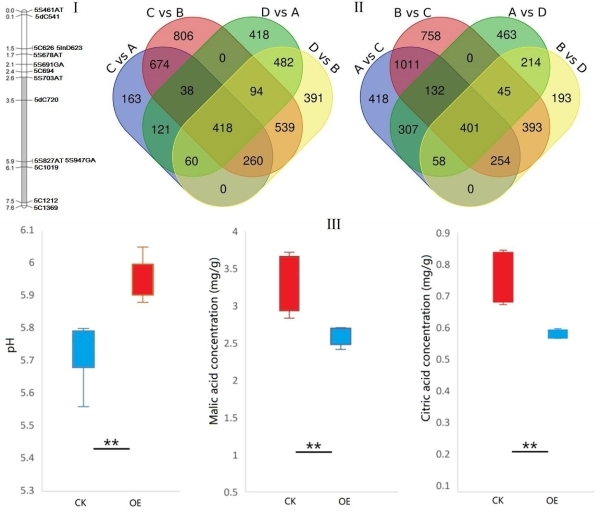 图Ⅰ:D位点酸度基因定位区间;图Ⅱ:转录组分析发现的桃非酸-酸品种的果肉发育差异基因;图Ⅲ:转化后发现PpRPH能导致pH值升高,有机酸含量降低;CK为对照,OE为过表达PpRPH