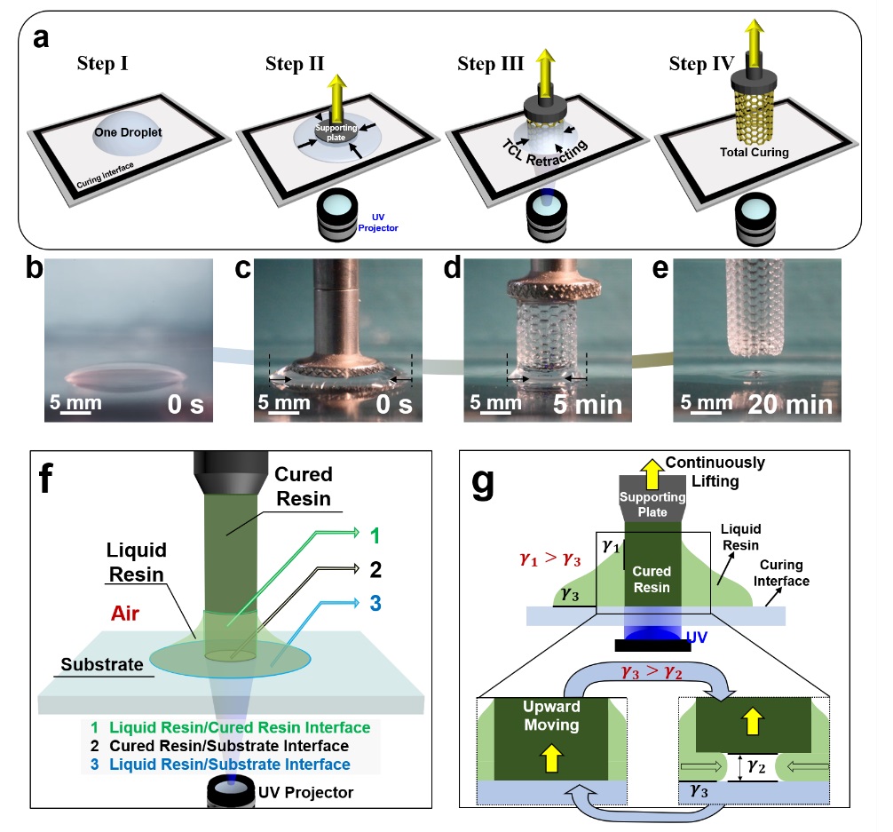 中国科学院化学研究所绿色印刷重点实验室宋延林课题组在前期发展的利用仿生超润滑固化界面来减少固化树脂与固化界面之间粘附(Research, 2018, 2018, 479560;Nature Communications, 2020, 11, 521)的工作基础上,提出一种单墨滴3D打印策略,利用界面操作方法可制备出具有可控形貌的精细3D结构,实现墨滴一滴成型,并提高打印过程的稳定性及精度。光固化界面的界面性质对于单墨滴打印较为重要,有利于单墨滴三相接触线(TCL)的连续收缩,实现高材料利用率的3D打印。研究表明,实现单墨滴3D连续打印需同时满足两个条件,即液体树脂与固化树脂间的粘附(γ1)应大于液体树脂与固化界面之间的粘附(γ3),以及液体树脂与固化界面之间的粘附(γ3)应大于固化树脂与固化界面的粘附(γ2),该规律为单墨滴3D打印的通用性奠定基础。通过调控墨滴尺寸和UV图案参数可控制单墨滴打印的净利用率,实现墨水一滴成型。该单墨滴连续3D打印方法为可控、按需个性化制备精细3D结构开辟新途径。