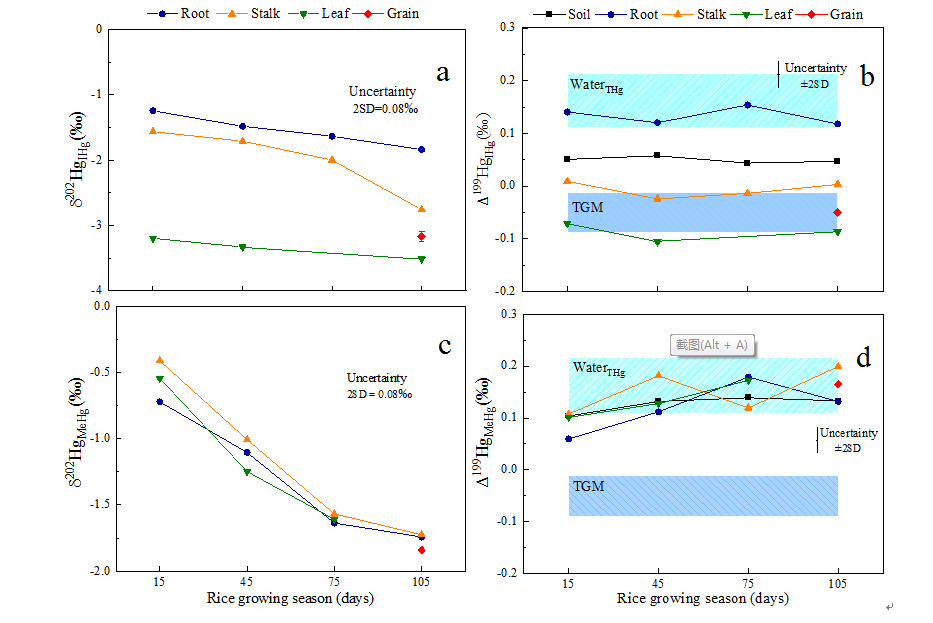 稻田生态系统无机汞与甲基汞的汞同位素分馏特征存在显著差异。水稻植株各部位无机汞的δ202Hg及Δ199Hg值差异明显,其无机汞的来源各不相同(图1a,b)。根据无机汞的汞同位素非质量分馏特征及模型计算,发现根系无机汞17-42%来自土壤、58-83%来自灌溉水,叶片和果实的无机汞几乎全部来自大气(~100%),而水稻茎同时受到土壤、灌溉水和大气汞的影响。不同生长周期水稻植株各部位的甲基汞汞同位素特征(δ202Hg和Δ199Hg)较为接近且逐渐趋向土壤甲基汞(图1c,d),水稻根部从土壤吸收甲基汞的过程以及植株各部位之间的甲基汞传输不存在明显的汞同位素质量分馏和非质量分馏。根据水稻植株各部位与大气、土壤、灌溉水甲基汞的汞同位素非质量分馏特征推断,水稻植株中的甲基汞均来自于灌溉水-土壤系统。这与团队前期研究结果一致,而汞同位素研究提供了更为直接有力的证据。