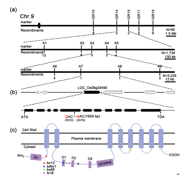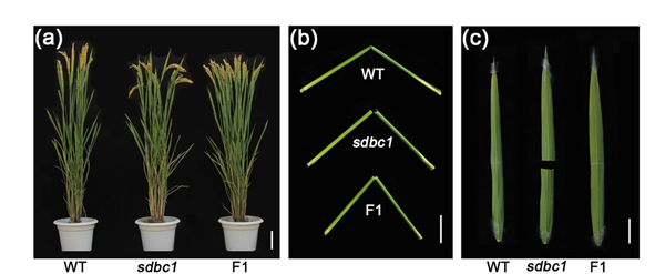 CEF1基因解决了常规稻秸秆还田难题,但对我国主推的杂交水稻来说,由于cef1的隐性遗传特性,难以直接应用。杂交稻生物量大、应用面积广,因此,产生的秸秆数量更多,如何处理也具有挑战性。研究人员利用重离子诱变,获得了一个半显性脆秆突变体Sdbc1;通过图位克隆,发现SDBC1基因编码的是一个纤维素合成酶催化亚基OsCESA9,在第387位保守的天冬氨酸(D)位点突变成为天冬酰胺(N)。