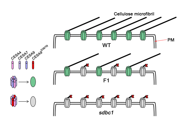 进一步实验表明,突变型的OsCESA9D387N蛋白能够竞争野生型OsCESA9,与OsCESA4和OsCESA7互作,形成没有功能或部分功能的纤维素合成酶复合体,从而影响纤维素正常合成。在sdbc1纯合突变体中,由于只能形成没有功能的纤维素合成酶复合体,因此,纤维素合成受到严重影响,其表型表现出茎秆和叶片都较脆。Sdbc1杂合突变体中,突变型OsCESA9D387N和野生型OsCESA9同时存在,且存在竞争关系,因此,只有一半的纤维素合成酶复合体能够正常行使功能,导致纤维素含量略微降低,秸秆表现出微脆的表型,而叶片无任何影响。此外,该位点的显性突变能够通过降低活性氧(ROS)的水平和体内的Na+含量,增加其耐盐性。