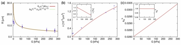 图2:理论数值与实验结果对比。(a)液滴尺寸随着弹性网络剪切模量的增大而减小。(b)液滴数密度随着弹性网络剪切模量的增加而增加。(c)稀相溶质的体积分数随剪切模量增大近似线性增加。