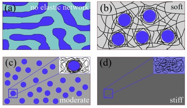 图1:(a)无弹性网络时液-液相分离形成的结构。(b)软弹性网络中形成的尺寸较大的液滴。(c)中等硬度的弹性网络中形成的数密度较大的小尺寸液滴。(d)硬弹性网络会抑制液-液相分离,导致无液滴产生。