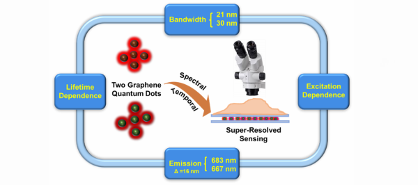 除超窄带发光外,这两种石墨烯量子点还具有发射波长在远红光范围(> 680 nm)、发射峰位置相近、激发波长和荧光寿命部分依赖等特点。基于此,理化所特种影像材料与技术中心与以色列巴伊兰大学工学院合作提出了基于超窄带发射石墨烯量子点的超分辨传感策略,并应用于光谱和空间超分辨成像传感检测。该方法无需使用光谱仪即可提取光谱信息,通过两种类型的窄带发光石墨烯量子点的独特波长和时间“特征”实现空间分离,在超分辨光谱和空间传感领域有潜在应用价值,如超分辨技术可以克服光学成像应用的光学衍射极限,有望填补电子显微镜(~1 nm)和普通可见光学显微镜(200-250nm)之间的空缺,观察到更精细的结构或更高分辨率的图像。