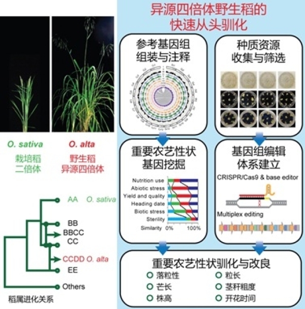 当前的栽培稻从祖先二倍体野生稻经过长时间的人工驯化而来,驯化过程在改良重要农艺性状的同时造成了遗传多样性的丢失。除二倍体栽培稻之外,稻属还有25种其他野生植物,按照基因组特征又可分成11类,包括6类二倍体基因组和5类四倍体基因组。其中,异源四倍体野生稻具有生物量大、自带杂种、环境适应能力强等优势,但也具有非驯化特征,无法进行农业生产。