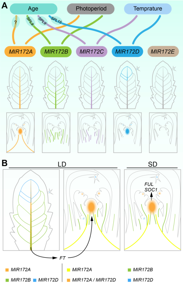 A. 不同MIR172基因表达模式图。每个MIR172基因用不同的颜色表示。两个SPL/MIR172对(SPL9-MI172B/C和SPL15-MIR172D)分别在维管和顶端促进开花潜能的获得。