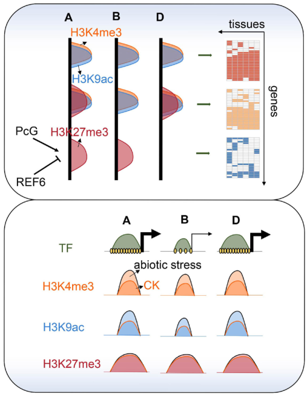 图1.主要发现小结。上图:在发育过程中,PcG复合体和REF6去甲基化酶协同调控H3K27me3动态变化导致调控元件在亚基因组间的活性差异,进而决定组织特异性;下图:在应激反应过程中,调控元件的密度,转录因子结合及表观修饰协同作用决定亚基因组的差异响应