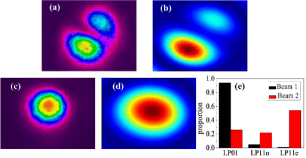图2.(a)、(c)SPGD算法最小值和最大值收敛后的红外相机光场分布;(b)、(d)模式重构出的光场分布;(e)各种本征模式占比