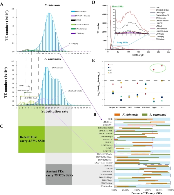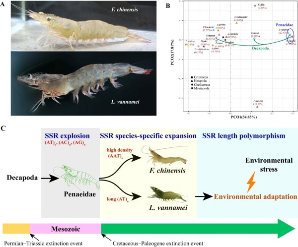 为了探究SSR的分布特征和功能,研究人员完成了另一种对虾——中国明对虾的全基因组测序和组装,并基于Hi-C测序,构建了凡纳滨对虾和中国明对虾染色体水平的基因组图谱。通过比较基因组学分析,推断SSR的爆发式扩张发生在对虾的祖先基因组上,而SSR的特异性扩张也出现在不同对虾分化后。SSR的扩张事件与生物大灭绝事件后对虾的快速进化时间一致,提示了SSR在对虾适应性进化过程中的关键作用。
