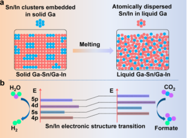 针对上述问题,吴长征团队将近室温熔融的金属Ga作为具有二氧化碳还原电催化活性的Sn和In的基底,从新的角度实现了Sn和In非均相催化剂的均相化。原位结构表征和第一性原理分子动力学模拟发现,固态时,Sn和In形成了相分离的纳米团簇,均匀嵌入在固态Ga基质中;液态时,Sn和In以单原子形式游离分散在熔融态Ga中。进一步的电子结构表征发现,和固态Ga相比,负载在液态Ga中的活性中心具有显著增强的还原性,使二氧化碳还原产物甲酸的选择性由固态时的30%左右提高到液态时的95%以上,析氢副反应得以明显抑制。此外,液态合金由于具有良好的氧化还原可逆性及表面组分的可流动性,表现出自修复特性,其催化稳定性得以显著改善。
